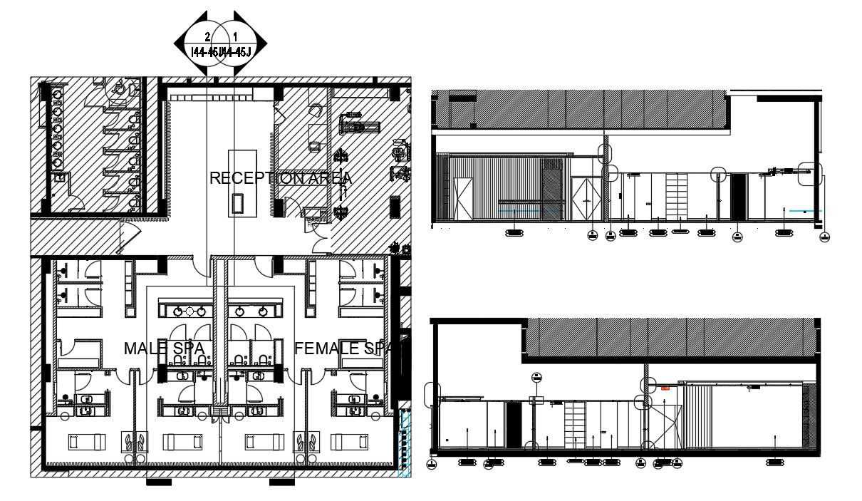 Sectional Elevation details of the SPA Hotel building designs are provided on this AutoCAD DWG Drawing File. On this ground floor male SPA treatment rooms, female treatment room, Reception area, and toilet are given in this drawing file. section details also are given in this drawing file. Download AutoCAD DWG File.Thank you so much for downloading the DWG file from our website.