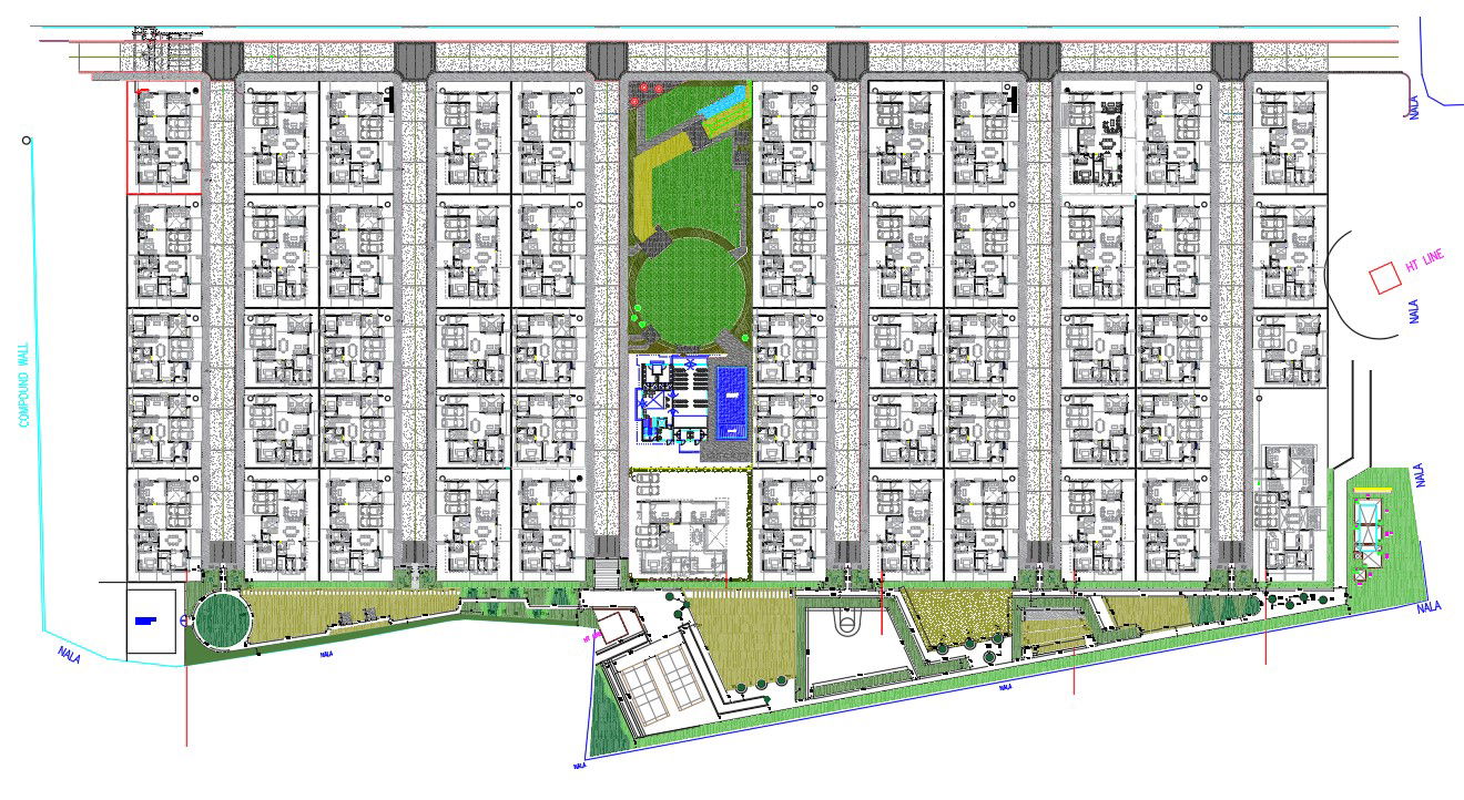 2d CAD drawing of residence house township master plan that shows car parking 2 BHK, 3 BHK house plan, road line, club house, garden, sports game play ground, and 6 gate for entrance in the society. Download the AutoCAD DWG file. Thank you so much for downloading DWG file from our website.