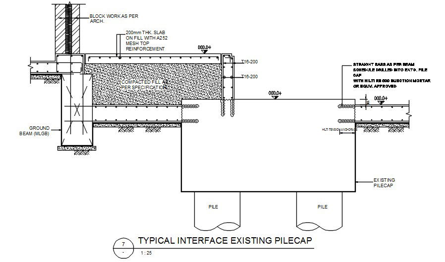 Typical Interface Existing Pilecap section details are given in this AutoCAD Drawing file. Slab on fill with A252 Mesh top reinforcement compacted fill per specification, straight bars as per beam scheduled drilled into extra pile cap, and the ground beam is mentioned. Download the AutoCAD 2D DWG file. Thank you so much for downloading the DWG file from our website.