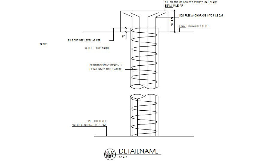 Spiral Pile foundation section details are given in this AutoCAD 2D Drawing file. pile cut off level, final excavation level,500 free anchorages into pile cap are mentioned. sectional details are given clearly. Download the AutoCAD file. Thank you so much for downloading the DWG file from the cadbull website.