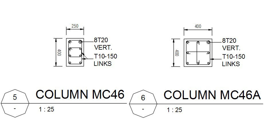 This drawing presents column mc 46 detailed autocad file. In this file you have 8t20 vertically and t10-150 links used in different size 250 x 400 and 400 x 400 respectively. detailed of naming were also are given clearly in this drawing. also it has made in 1:25 scale.Download the Auto Cad 2D DWG file now. Thanks for downloading the file and another CAD program