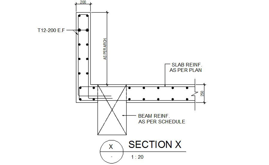 200 x 250 mm size of bar showing section detailed reinforcement drawing file. it has made in 1:20 scale. which is consist of slab detail and beam detail mentioned with steel bar drawing.this drawing can be used for civil drawing, working drawing. Download this 2d autocad drawing dwg file.