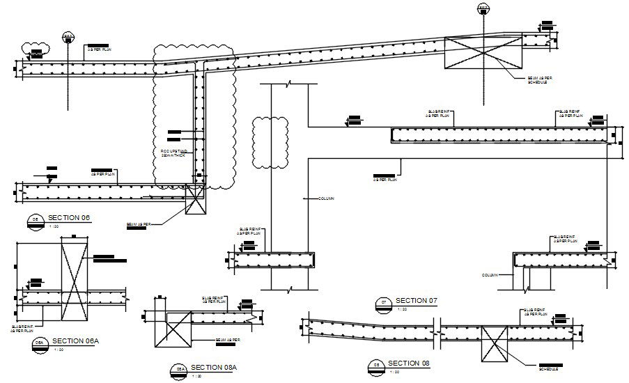 Reinforcement structure detail presented in this autocad drawing file.several section detail given in this file with naming and dimensions. Slab detail and beam detail mentioned with steel bar drawing.this drawing can be used for civil drawing, working drawing. Download this 2d autocad drawing dwg file.