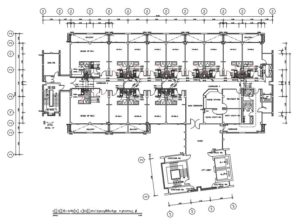 the multi-specialist hospital layout plan CAD drawing which consist VIP room and grand VIP room with an attached toilet, wash basin, balcony and AC conduct. also has all dimension detail with center line plan. This drawing is must verity all dimensions on site. Only figured dimensions and grid line are to be worked from. before the reuse this plan must be immediately to the architect or engineer concerned before further action. download hospital floor plan DWG file.