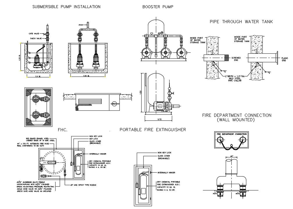 Fire booster connection with water pipe line installation CAD drawing that shows submersible pump installation, booster pump, pipe through water tank, portable fire extinguisher and fire department connection (wall mounted). there area red baked enamel steel cabinet made of 16 bwg steel and automatic fire hose reel conforming. download DWG file of fire connection on the building.