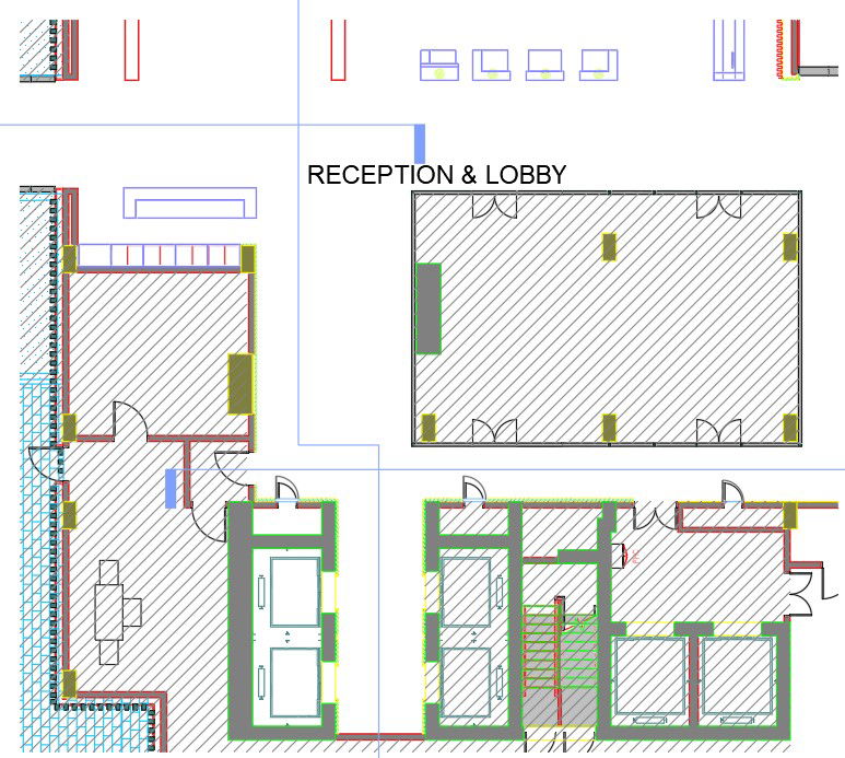 Reception and lobby floor plan detail described in this AutoCAD drawing file. In this file, you will have ground-floor consist of a lift corridor, office, services with projections line. This can be useful for architecture drawing, interior drawing, and working drawing. Download the Auto Cad 2D DWG file now.