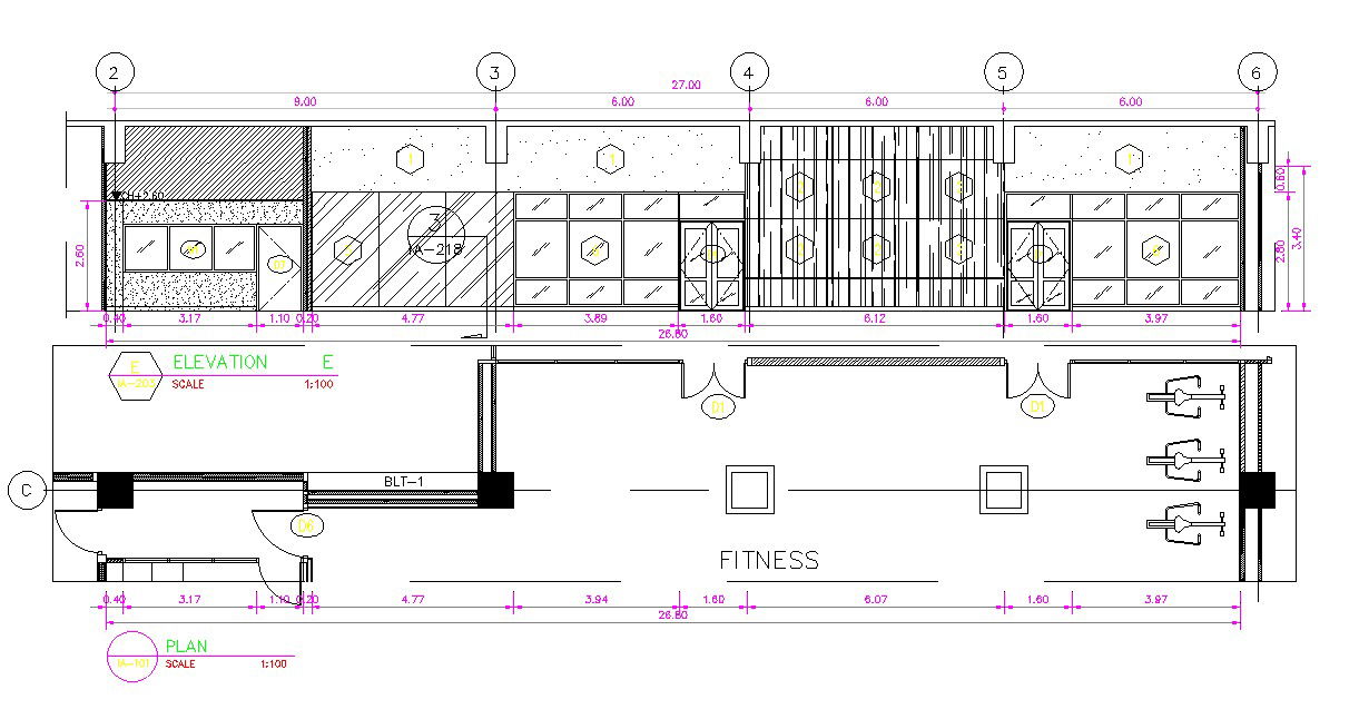 Fitness building floor plan and the elevation are given in this 2D AutoCAD DWG file. Download the AutoCAD drawing file now.