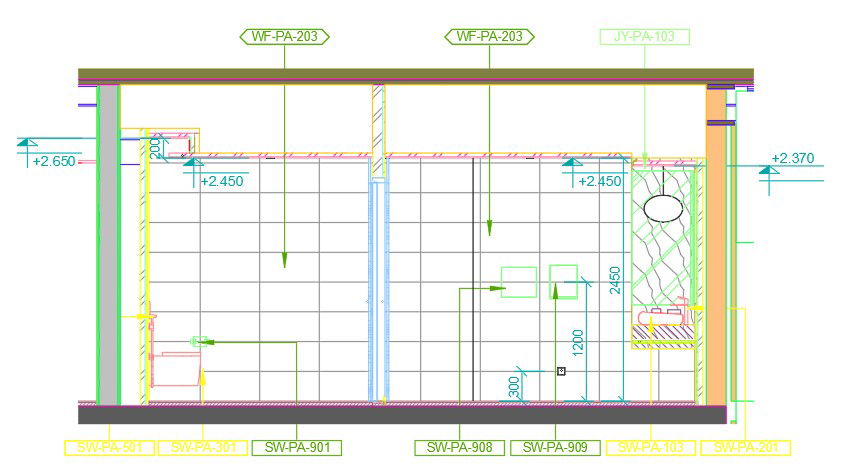 Section detail of the corridor shown in this cad drawing file. In this file, wall tiling of the toilet, dimensions detail. also, beam detail given with different indicator and material name code given in this file. Download the AutoCAD drawing file now.