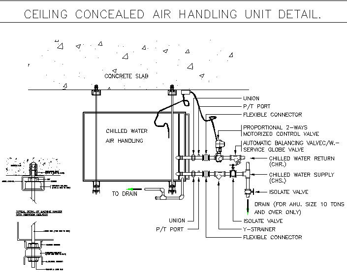 The ceiling concealed air handling unit section details are given in this 2D AutoCAD DWG file. In this file, the section details of the ceiling concealed air handling unit are mentioned. The concrete slab,, chilled water air handling, union, flexible connector, and drain was mentioned clearly in this drawing. Thanks for downloading the AutoCAD file and another CAD program from the cadbull website. Download the 2D AutoCAD DWG file now.