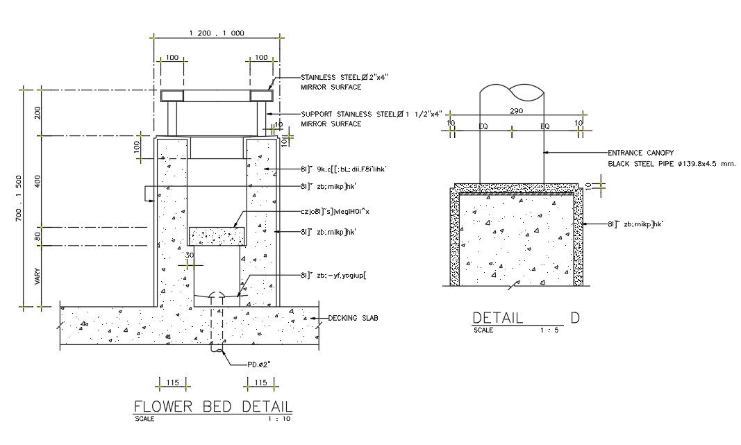 The Flower Bed Planting section CAD drawing which consist RCC layer and thickness of materials like water proofing, planting, grading Concrete, cardinal flower, and swamp milkweed. download free DWG file of landscape bed blocks detail DWG file.