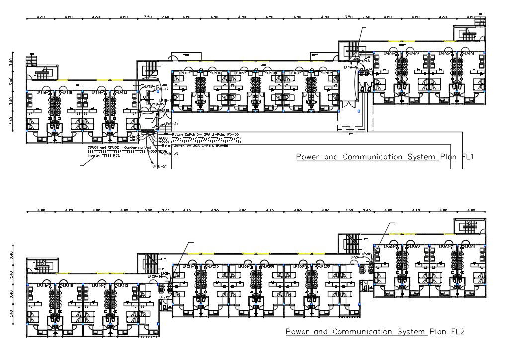 Air conditioning conduit outside the building Even if in the eaves, use IMC and Box. Waterproof cast metal. The electric wire connecting to the CDU is to use FMC Rain tight not longer than 1.5 meters - Digital Timer must be installed for the air conditioner to work alternately to work 24 hours a day. 1. In case of wiring / conduits in front of the room on every floor, walk to the floor Or belly beam or wall Do not hang. 2. Conduits in the fire escape compartment And outside the building above the ground, use IMC and Box, waterproof cast metal. Download power and electrical communication system CAD drawing DWG file.