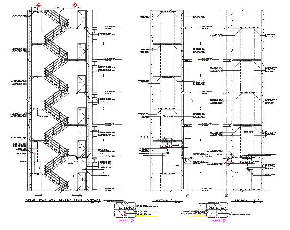 The building staircase section CAD drawing which consist emergency circuit, lighting fixture battery pack and lighting system and fire alarm system design. also has RCC slab, stain less steel railing design. Thank you for downloading the autocad 2D DWG drawing file and other CAD program files from our cadbull website.