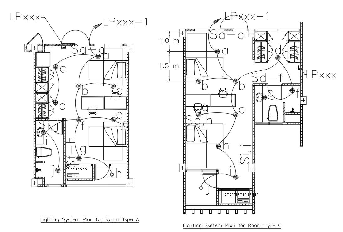 The bedroom electrical lighting system plan CAD drawing which consist Number of embedded ceiling = 10 sets / room. Number of suspended lamps = 1 set / room. Number of switches = 10 sets / room. The load for electrical calculation = 300 VA. The approximate position of the lamp is approximate. Modified as appropriate. Refrigerators and washing machines are not included in this project. download room with electrical ceiling layout plan design DWG file.