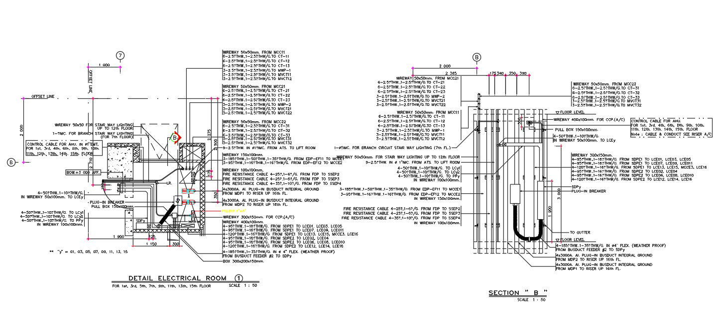 The Electrical wiring instillation CAD drawing which consist wireway 50x50mm for stair way lighting up to 12th floor, branch circuit stair way lighting, and branch stair way lighting. In case of wiring / conduits in front of the room on every floor, walk to the floor Or belly beam or wall. download free DWG file of electrical wiring fixture detail.
