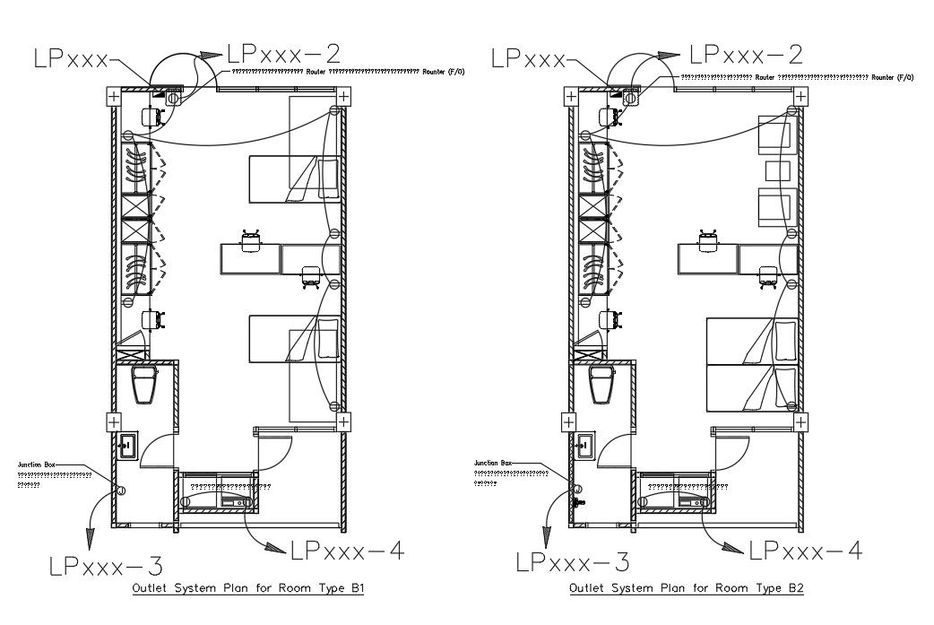 The electrical room outlet system CAD drawing that shows Installed near the ceiling for the router. Installed with the Router (F / O) distribution. Number of electrical outlets with safety curtains = 9 sets / room. Refrigerator and washing machine not included in this project. Junction Box for water heater. To be buried in the wall about 2 meters from the ground. Box is plastic, waterproof cover, keep the end of the line L, N, G, not less than 0.3 meters each. download electrical ceiling wiring design DWG file.