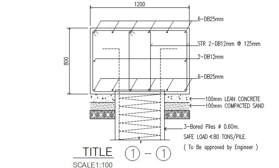 Section detail of 800 x 1200 mm size of bar reinforcement drawing file. it has made on 1:100 scale. which is consist of 3 bored piles, 6-DB25mm, 2- DB12mm, 6-DB25 mm.with slab detail and beam detail mentioned with steel bar drawing. this drawing can be used for civil drawing, working drawing. Download this 2d AutoCAD drawing dwg file.