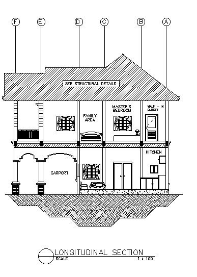 Longitudinal section details of the G+1 house AutoCAD DWG drawing file is provided. Sectional details and the dimensions are clearly given in this drawing file. Also, carport, family area, kitchen, walk closet are mentioned in this DWG file. Download the AutoCAD 2D DWG file. Thank you so much for downloading DWG file from our website