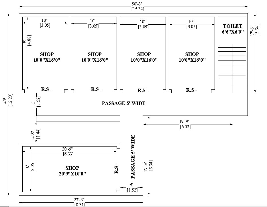 50'X 40' Commercial shop building floor plan is given in this AutoCAD DWG file. A total of five shops are available in this drawing. in that four shops having room dimensions of 10'X16' and another fifth shop placed separate and the dimension is 20'9" X10'.The staircase is also available at the entrance of the building. Download 2D Autocad Drawing DWG and PDF file.