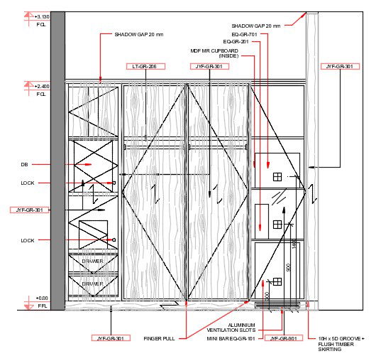 The wardrobes front detailed elevation stated in this cad file. the detail of one is open storage with two drawers and two-door is a finger pull with lock detail and one is an MDF storage with aluminum ventilation also presented dimensions detail and material name detail. Download this 2d AutoCAD drawing file.