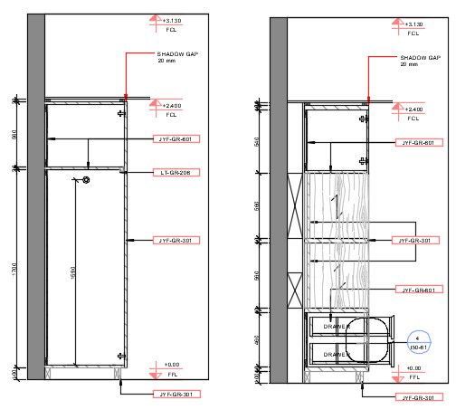 Section detail of the wardrobe with detailed side elevation shown in this cad drawing file. . Download this 2d AutoCAD drawing file.