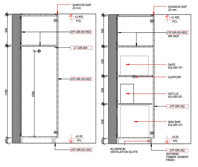Wardrobe Section detail and side elevation is shown in this cad drawing file.Download this 2d AutoCAD drawing file.