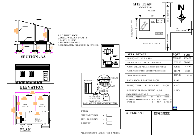 23'X 20' 2bhk East facing small House Plan As Per Vastu Shastra. The total buildup area of this house is 470sqft. The kitchen is in the Southeast direction. The Hall Placed in the Northeast direction. Puja room is in the west. The master bedroom is available in the southwest direction The common toilet is placed in the northwest under the stairs. A staircase is available in the northwest. This house plan detailed section and Elevation are given. Also, Door and window joinery details and area details are clearly mentioned in this drawing. Download free Autocad Drawing DWG and PDF files.