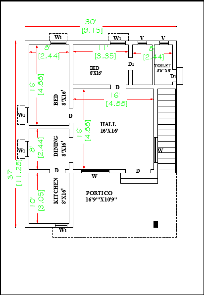 30'X37' East facing two bhk house plan as per Vastu Shastra. The master bedroom is in the southwest direction. Children's bedroom is in the west and the attached toilet is in the west. The common toilet is placed in the northwest.kitchen is placed in the southeast. Dining is near the kitchen is in the south. Hall and portico are available in the northeast direction. The staircase is placed in the north direction outside of the house. Download Autocad DWG and PDF file.