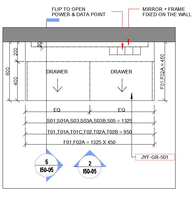 Drawer detail drawing stated in this cad file. this drawing consists of two drawer detail with a mirror plus frame fixed on the wall and power and data point given. this can be used for interior and architecture drawing. Download this 2d Autocad drawing file.