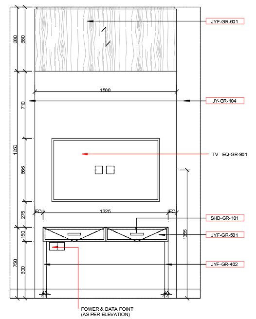Tv unit elevation detail provided in this cad drawing file. The total height of the unit is 1660 and the width is 1500mm.this drawing presents two drawer detail and tv block with power and data point. This can be used for interior design. Download this 2d AutoCAD drawing file.