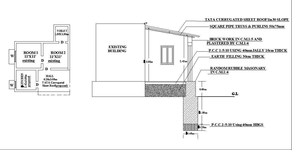 Small House plan layout and section details are available in this drawing file. In this Plan a master bedroom with an attached toilet, Kid's bedroom Kitchen, and hall are available. The section details of this small house plan drawing are given clearly. Download the AutoCAD Drawing file.