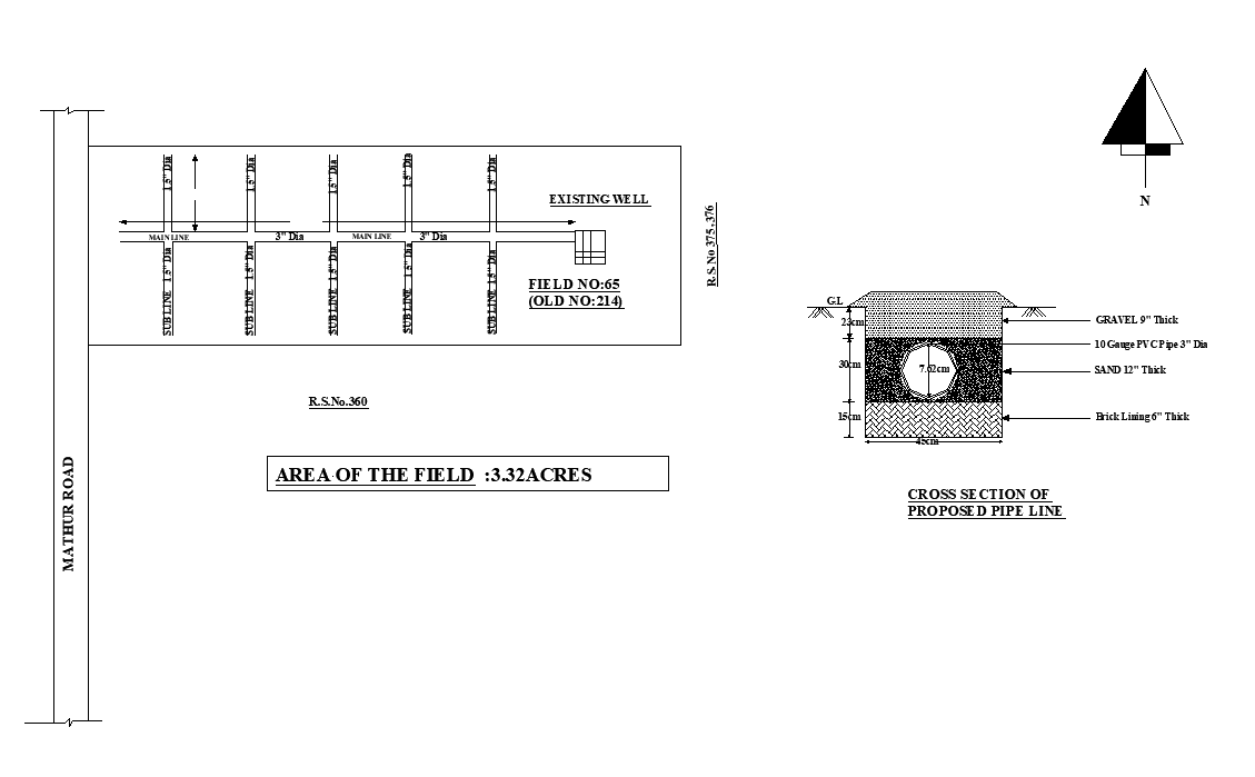 Cross-section of the proposed pipeline connection is given in this AutoCAD DWG file. In this file, gravel thickness, 10 gauge PVC pipe, and 12" thick, brick lining 6" thick is mentioned in this drawing. Thanks for downloading the AutoCAD file and another CAD program from the cadbull website. Download the AutoCAD DWG file now.