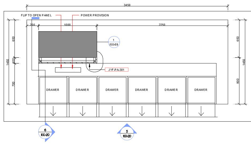Drawer detail of corporate building specified in this cad drawing file. six drawer detail with power provision and flip to open panel. dimensions and naming detail are given. this can be used for interior and architecture drawing files. Download this 2d AutoCAD drawing file.