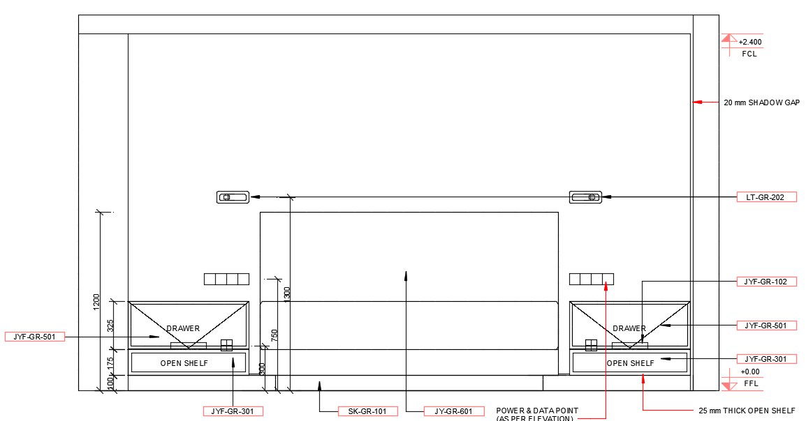 The front elevation detail of bed design stated in this cad drawing file. two drawer detail with two open shelves given in it. dimensions and naming detail are given in this cad file. this can be used for interior and architecture drawing files. Download this 2d AutoCAD drawing file.