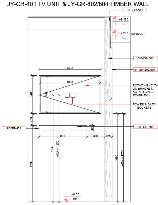 Tv unit design stated in this AutoCAD drawing file. tv size 1040 x 640 mm with data point and 1800 mm hight of tv. wall material would be timber in this file. this can be used for interior and architecture drawing files. Download this 2d AutoCAD drawing file.