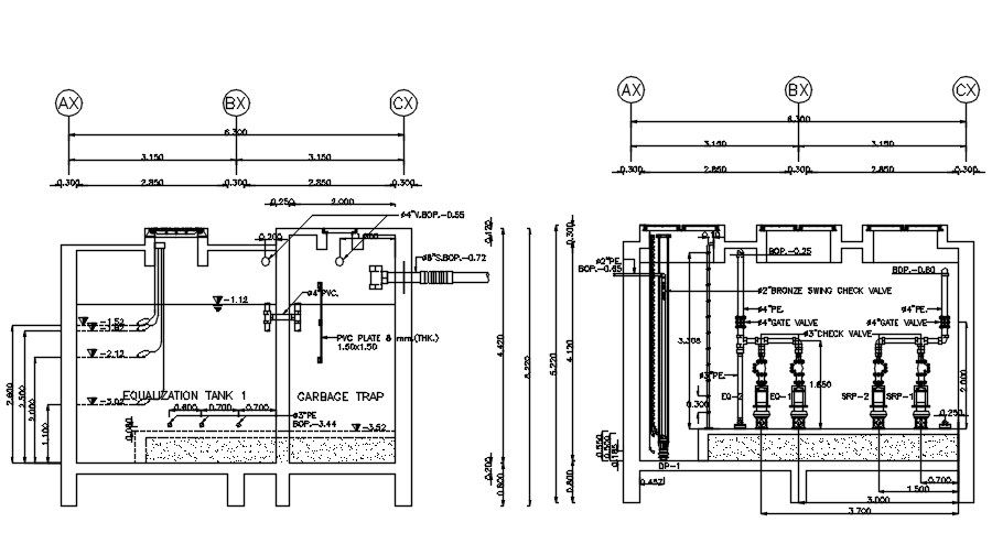 The Equalization tank section details are given in this AutoCAD DWG drawing. Sectional details are clearly given in this drawing file. Equalization tank, Garbage trap, gate valve, Bronze swing check valve is available in this DWG file. Download the AutoCAD 2D DWG file. Thank you so much for downloading the DWG file from the cadbull website.