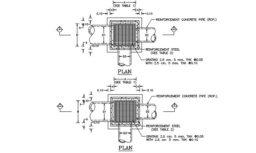 Reinforcement concrete pipe and reinforcement steel plan section details are given in this AutoCAD DWG drawing. Sectional details are clearly given in this drawing file. Grating, dimension details are available in this DWG file. Download the AutoCAD 2D DWG file. Thank you so much for downloading the DWG file from the cadbull website.