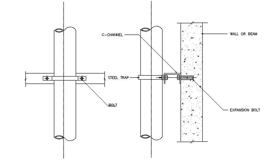 Steel trap bolt connection on the beam is given in this AutoCAD DWG drawing. Sectional details are clearly given in this drawing file pipe connections on the wall or beam are available in this DWG file. Download the AutoCAD 2D DWG file. Thank you so much for downloading the DWG file from the cadbull website.
