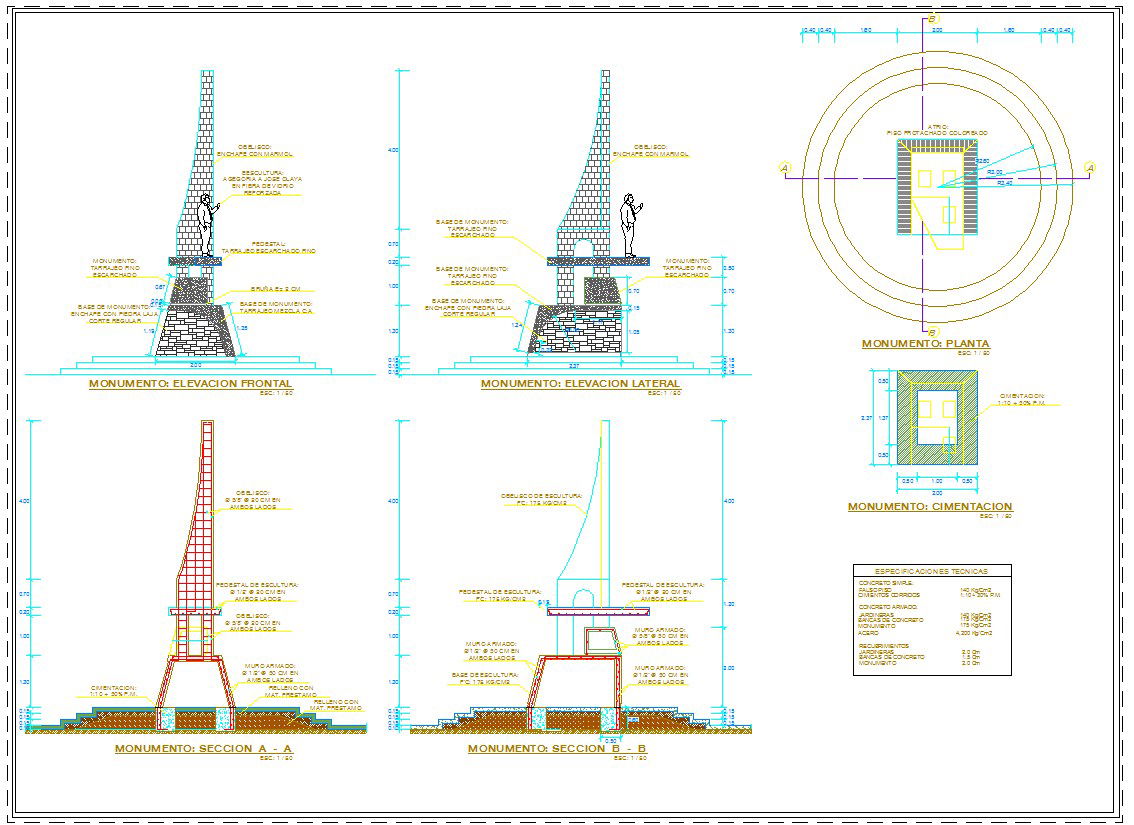 Structure detail for Tower of Statue And Sculpture: Jose olaya In fiber glass Reinforced, Base of monument: Fine tarring frosty, Armed wall Ø 1/2 "@ 30 cm in both sides, Sculpture pedestal: Ø 1/2 "@ 20 cm in both sides etc detail.