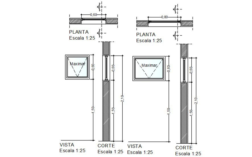 0.60m x 0.60m and 0.60m x 0.80m size of window detail specified in this file. Download this 2d autocad drawing file.