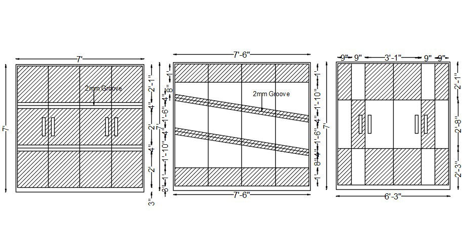 This AutoCAD 2D DWG drawing file offers detailed wardrobe section and elevation views, including dimensions and sectional details. The wardrobe sizes provided are 7' x 7', 7'6" x 7', and 6'3" x 7', with clear labeling and measurements. Designed for architects and interior designers, this file aids in creating accurate and functional wardrobe designs for residential or commercial spaces. The DWG format ensures compatibility with AutoCAD, allowing seamless integration into your design projects. Utilize this resource to enhance your design efficiency and precision.