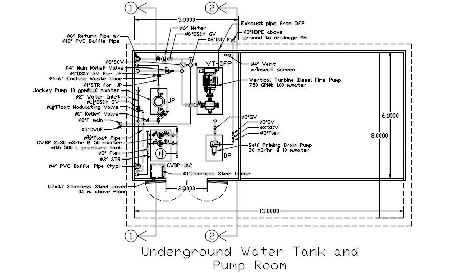Underground water tank and pump room detail drawing presented in this AutoCAD drawing file. this file presents two projections line with naming detail with dimensions detail. this can be used by architects and civil engineers. Download this 2d AutoCAD drawing file.