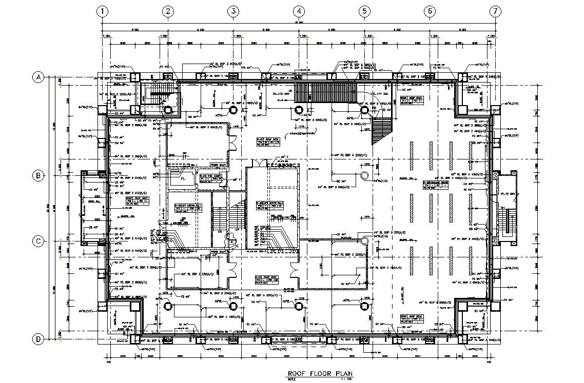 Roof floor plan specified in this AutoCAD drawing file. this drawing of the corporate building roof terrace plan which shows center line plan with dimension details along with roof dimension details, and roofing components details. download free DWG file of building blocks plan drawing.