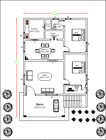 33'X 51' north-facing double bhk single storey house plan is available in this DWG CAD file. Download free Autocad DWG and PDF file format of this house plan drawing.