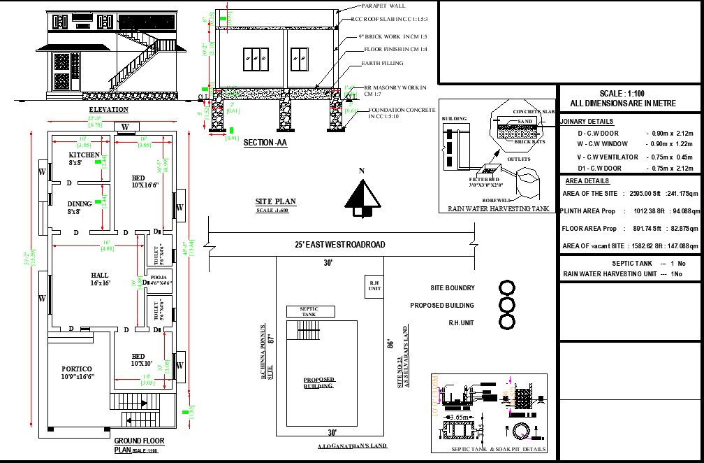 22'X51' blueprint plan of north-facing 2bhk house plan as per Vastu Shastra is given in this drawing file. The Buildup area of this house plan is 1012 sqft. The master bedroom is in the southwest direction with the attached toilet in the west and the children's bedroom is in the north direction with the attached toilet in the northwest. puja room is in the south. kitchen is placed in the southeast. dining is placed in the south under the inner staircase. Hall and portico are available in the northeast direction. The staircase is placed in the south direction inside of the house. Typical sections and Elevation details of this house plan are given. Also, Door and window joinery details and area details are clearly mentioned in this drawing. Download Autocad DWG and PDF file format of this house plan.