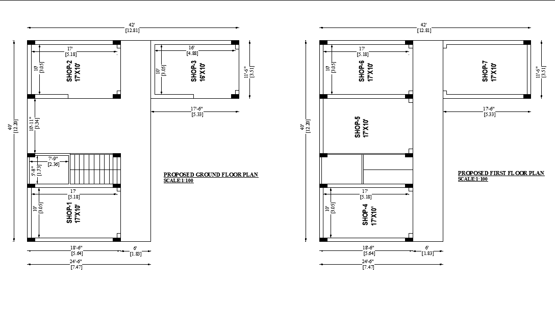 42' X 40' G+1 Commercial shop building is given in this AutoCAD DWG file. Download 2D Autocad Drawing DWG and PDF file.