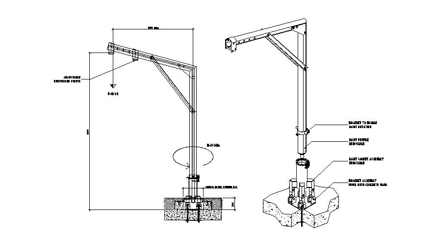 Street light post typical section details are given in this AutoCAD DWG drawing. Sectional details are clearly given in this drawing file. bracket to enable davit rotation, davit profile removable, davit socket assembly removable, bracket assembly fixed onto concrete slab adjustable suspension points are given in this DWG file. Download the AutoCAD 2D DWG file. Thank you so much for downloading DWG file from our website