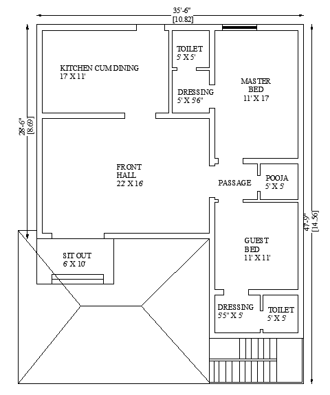 2 BHK residence plan presented in this AutoCAD drawing file. 47'9" x 35'6" size of plot area given in it. this drawing consists of a hall, master bedroom, pooja room, guest room, kitchen area with dimensions detail. also, services and utilities detail given. Download this 2d AutoCAD drawing file.