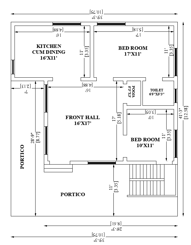 2 BHK residence plan stated in this AutoCAD drawing file. 41'3" x 35'3" size of plot area given in it. this drawing consists of a hall, master bedroom, pooja room, bedroom, kitchen area with dimensions detail. also, services and utilities detail given. Download this 2d AutoCAD drawing file.