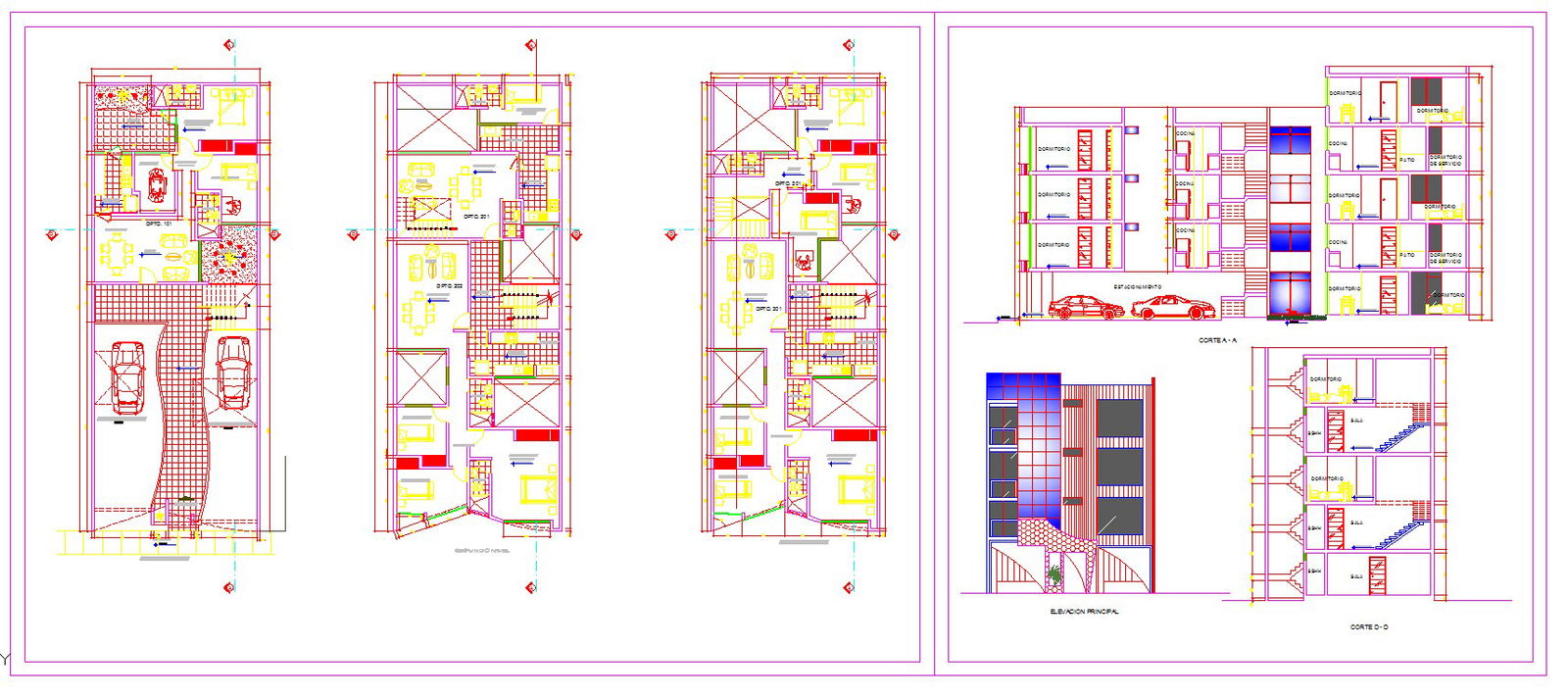 2 Bhk apartment architecture drawing and detail include presentaions plan, working plan, sections, elevations and detail of sections.