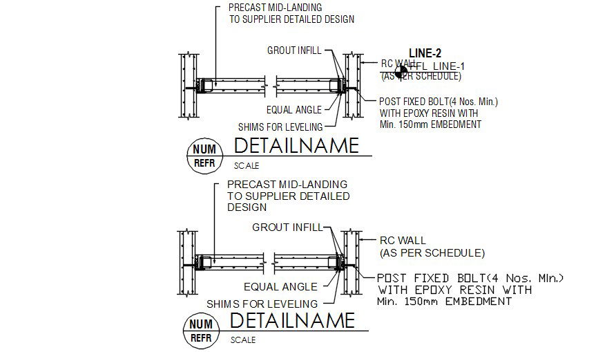 Precast mid landing to supplier detailed design are given in this AutoCAD Drawing File. In this file, Grout infill, RC wall, postfixed bolt with epoxy resin, shims for leveling, and the sectional details were clearly given. The section detail and the dimension were also are given clearly in this drawing. Download the AutoCAD file now. Thanks for downloading the file and another CAD program from the cadbull.com website.